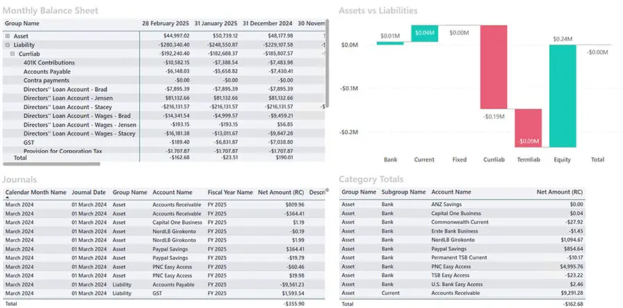 Stop digging through static reports. Our interactive balance-sheet view lets you monitor assets, liabilities, and equity at a glance, updated as soon as new transactions sync. Perfect for board packs or investor updates where accuracy and speed matter.