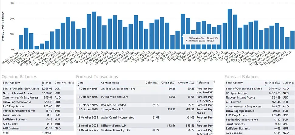 Turn historical trends into live, automatic forecasts. Build rolling weekly or monthly cash-flow projections that update with every bank feed, essential for managing growth or preparing for seasonal dips.