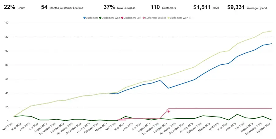 Visualise new-customer growth alongside churn rates. Quickly see how marketing campaigns or seasonal factors impact retention and acquisition.